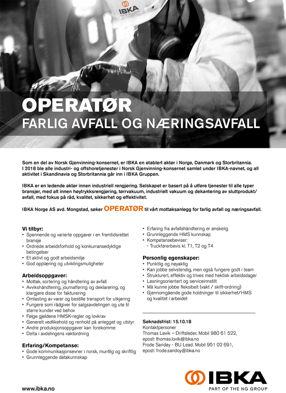 IBKA Norge AS avd. Mongstad, søker operatør til vårt mottaksanlegg for farlig avfall og næringsavfall.